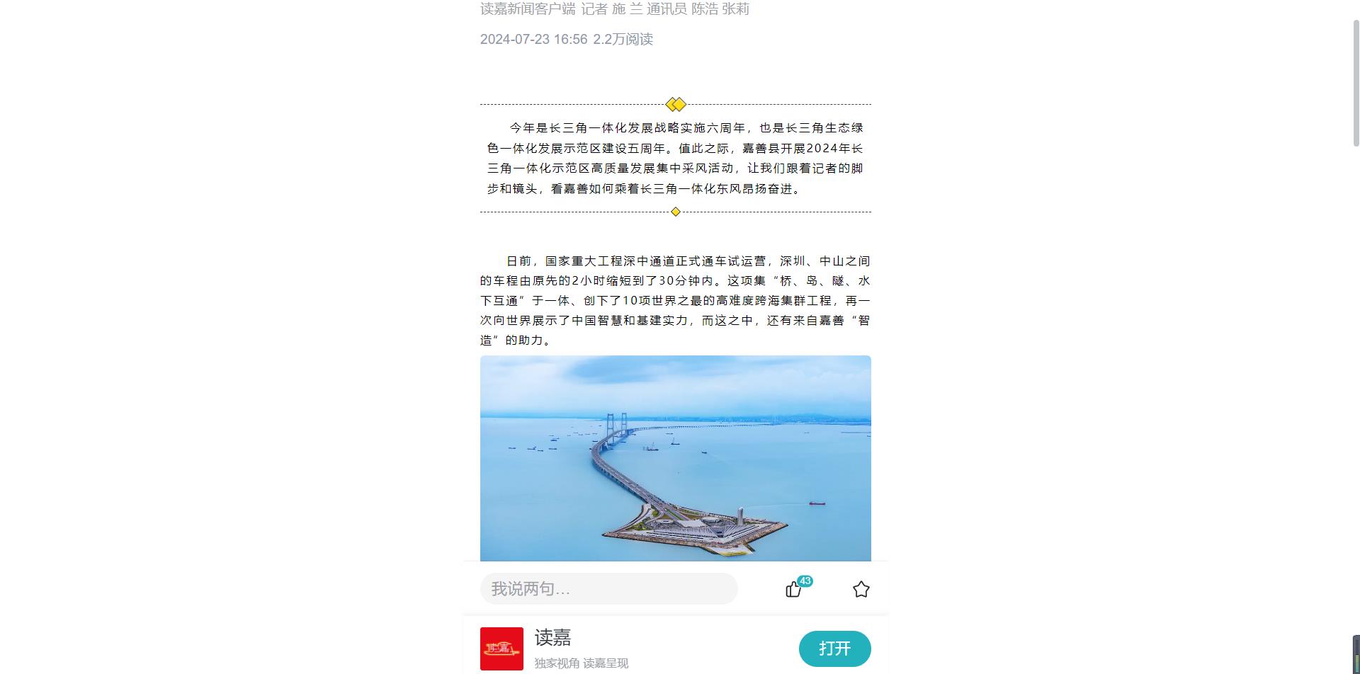 日前,國家重大工程深中通道正式通車試運營,深圳、中山之間的車程由原先的2小時縮短到了30分鐘內。這項集“橋、島、隧、水下互通”于一體、創下了10項世界之最的高難度跨海集群工程,再一次向世界展示了中國智慧和基建實力,而這之中,還有來自嘉善“智造”的助力。