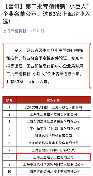 去年11月13日,上海三思還入選工業和信息化部辦公廳“第二批專精特新小巨人企業培育”名單,進一步推動企業高質量發展,提高企業專業化能力和水平。