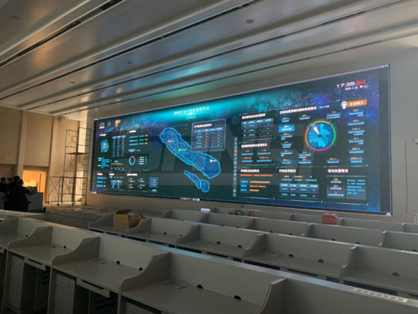 在崇明城運中心3層指揮大廳內,一塊點間距1.25mm全彩小間距LED主屏格外矚目,160°廣視角,整屏觀看全覆蓋,借助超高清分辨率信號傳輸技術實現顯示畫面100%數字化與點間距微縮化,畫面流暢無撕裂。