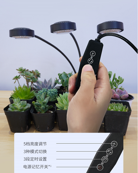 通過線上控制器,燈亮狀態(tài)下,短按分別開啟 3/6/12 小時倒計時,當?shù)褂嫊r結(jié)束后,燈具將自動關(guān)閉,出門忘記關(guān)燈再也不怕不怕了;不管家里種的是喜陽植物,還是喜陰植物,通過5檔亮度調(diào)節(jié),可以選擇合適光照;通過3種模式靈活切換,植物苗期、生長期、開花期、結(jié)果期不同光照需求,一盞燈就可以輕松搞定;想要打開之后的燈保持關(guān)閉前的亮燈狀態(tài),通過電源記憶開關(guān)就可以實現(xiàn)啦,同時每按電源記憶開關(guān)一次即可關(guān)閉一個燈,按鍵3次后,3個燈全部關(guān)閉。