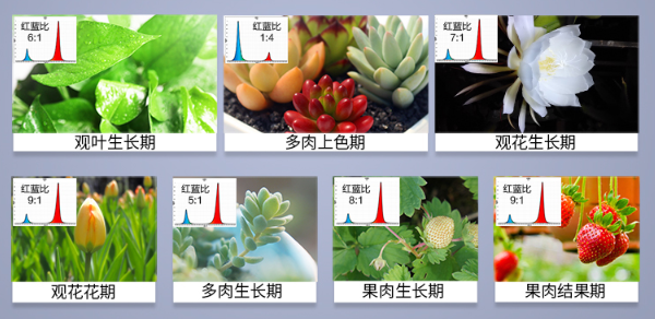 預設7種植物光譜,多肉生長/上色難題一燈搞定。