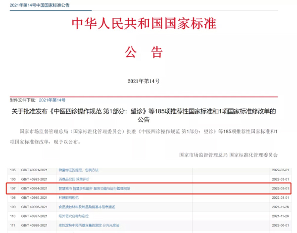 11月26日,國(guó)家市場(chǎng)監(jiān)督管理總局國(guó)家標(biāo)準(zhǔn)化管理委員會(huì)發(fā)布了《2021年第14號(hào)中國(guó)國(guó)家標(biāo)準(zhǔn)公告》,批準(zhǔn)發(fā)布包括《智慧城市 智慧多功能桿 服務(wù)功能與運(yùn)行管理規(guī)范》在內(nèi)的185項(xiàng)推薦性國(guó)家標(biāo)準(zhǔn)。值得一提的是,該標(biāo)準(zhǔn)是我國(guó)智慧燈桿產(chǎn)業(yè)所迎來(lái)的首個(gè)國(guó)家標(biāo)準(zhǔn)。