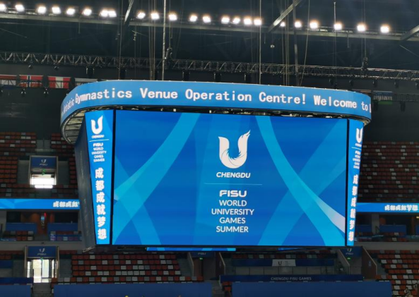 在本屆成都大運會藝術體操項目的比賽場館——成都體育學院綜合館內,就有兩塊三思制造的P6的室內全彩屏,顯示面積總計110㎡,畫面細膩流暢,恢弘大氣的畫面格外引人注目。