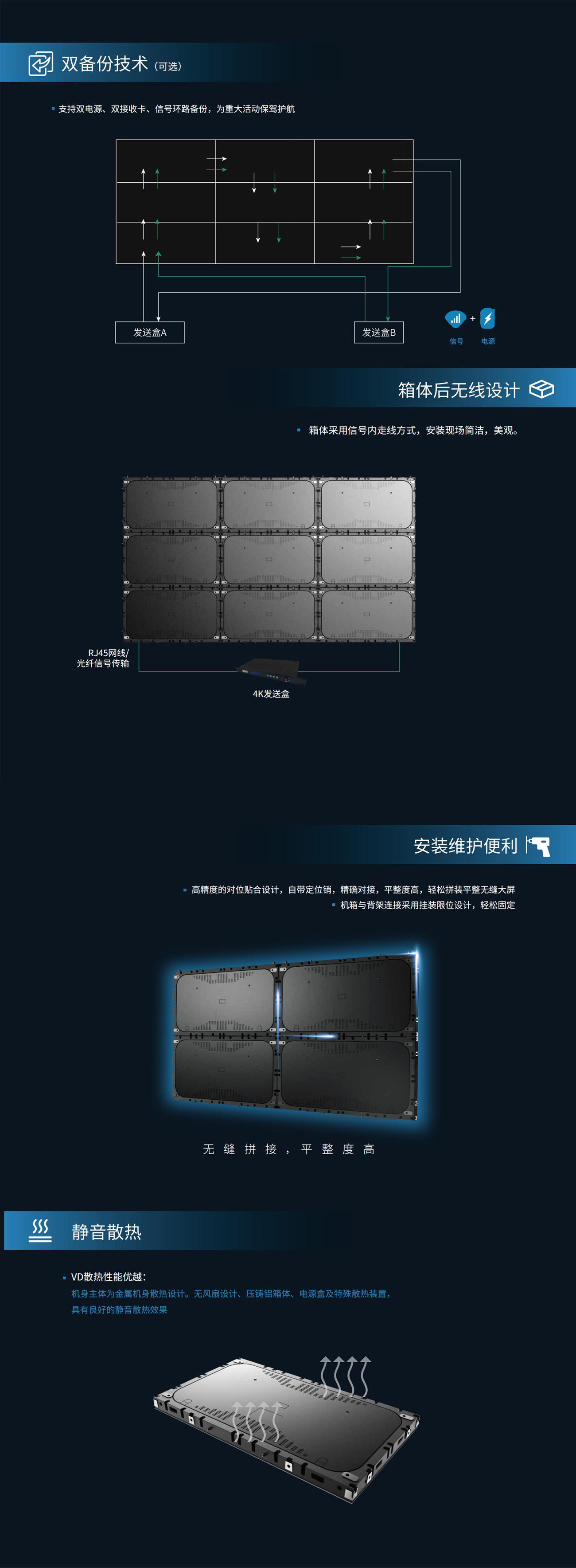 VD系列是一款高性價比、輕薄、設計簡約的后維護顯示產品,適用于會議中心、演播廳、監控中心等應用場所。壓鑄鋁機箱纖薄輕巧,更小化安裝和運輸成本。無需過多的人工調整便能達到小縫隙、平整的整體效果。背部散熱孔設計更好地發揮了空氣自對流散熱能力,產品運行穩定可靠。
